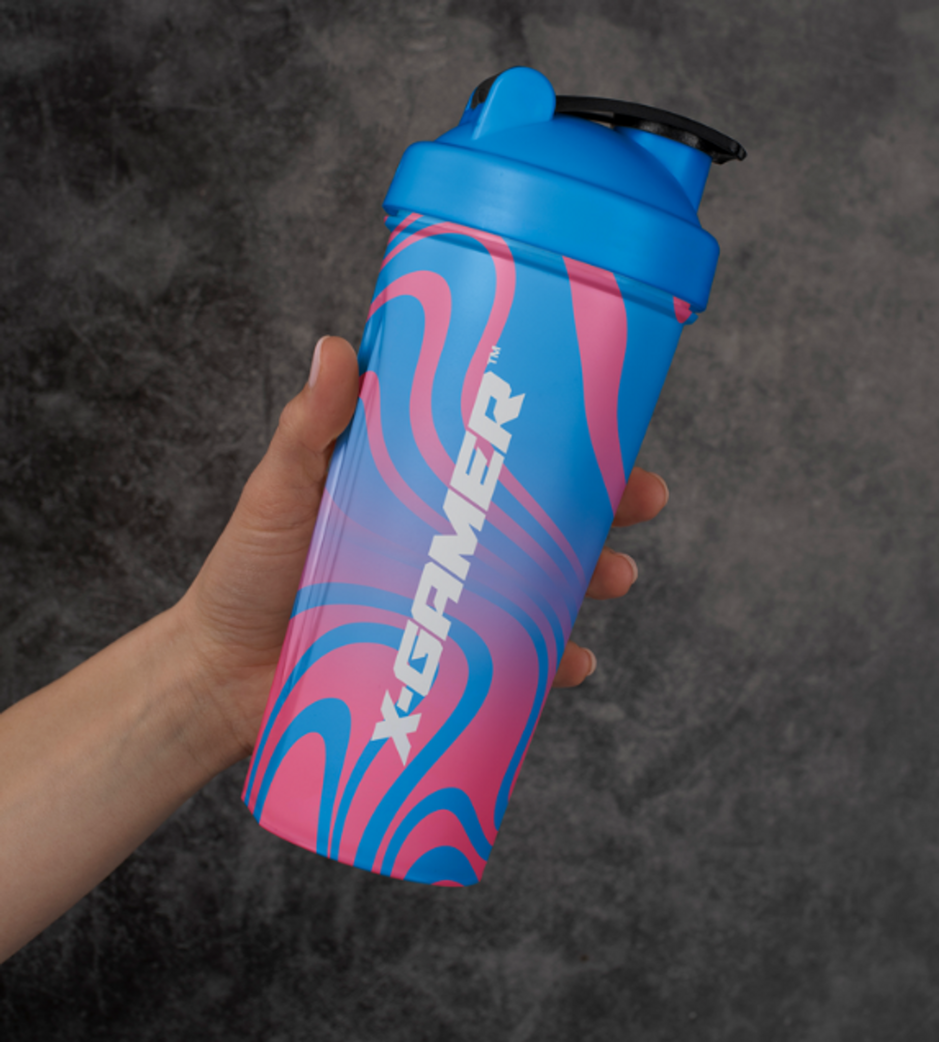 X-Gamer Swirly Blue & Pink Shaker! This durable, BPA and  DEHP-free shaker holds 700ml, perfect for mixing your favorite X-Zero on the go.